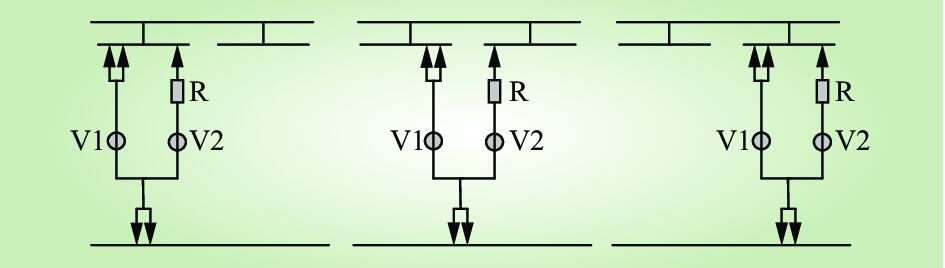 (3)真空滅弧型。機械式真空滅弧型有載調(diào)壓開關不同于傳統(tǒng)的絕緣油滅弧,分接頭切換在真空管中完成,不存在切換電弧造成油劣化和污染問題。機械式真空滅弧型有載調(diào)壓開關功能實現(xiàn)的關鍵是真空切換開關的選擇與過渡電路的設計,性能水平主要取決于真空觸點的切換參數(shù),包括額定電流、額定電壓與額定容量。機械式真空有載調(diào)壓開關切換電路具體如圖3所示[16],R為過渡電阻,V1、V2為真空管。