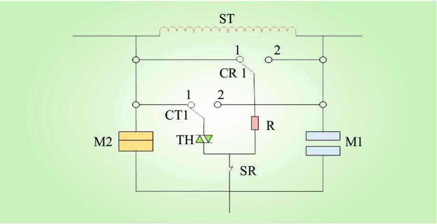 組合式分接開關的每一相切換開關采用一個晶閘管,機械觸點M1與M2為主通觸頭,在非切換狀態(tài)下電流流通M1或M2。在開關切換的整個過程中,由于機械觸頭都是在不帶電流情況下分開,因此不會造成觸頭燒損和油污染問題,相對傳統(tǒng)的機械式有載分接開關,壽命期內(nèi)無需更換觸頭,維護檢修的工作量將大大減少。該組合式分接開關是一種典型的機械電子混合式結(jié)構(gòu),由機械觸頭與晶閘管結(jié)合而成,可實現(xiàn)無電弧切換,但該類型組合式開關的操作與控制較為復雜。