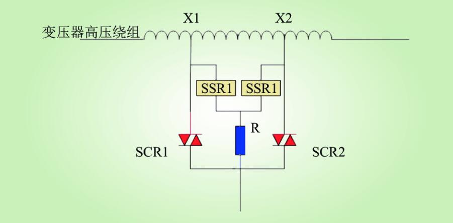 圖7中的X1和X2為有載調(diào)壓型配電變壓器的高壓繞組的2個抽頭;SCR1和SCR2為無觸點電力電子開關雙向晶閘管,SSR1和SSR2R為固態(tài)繼電器,R是起限流作用的過渡電阻。假定最初有載調(diào)壓型配電變壓器運行在繞組分接頭X2位置,雙向晶閘管SCR2則處于全導通狀態(tài),電流通路為X2-SCR2,SSR1、SSR2、SCR1均處于斷開狀態(tài)。當需要將分接頭由X2調(diào)整到X1時,調(diào)整過程具體包括:先觸發(fā)導通固態(tài)繼電器SSR1,然后關斷SCR2,電流通路變?yōu)閄1-SSR1-R,再觸發(fā)導通SCR1,電流通路變?yōu)閄1-SCR1,這樣就完成了一次分接的轉(zhuǎn)換。與傳統(tǒng)機械式有載調(diào)壓開關相比,不存在任何的運動部件和電動操作機構(gòu),真正消除了原有的故障隱患,完全由軟件控制實現(xiàn)分接的選擇和快速切換。該方案還處于研究與完善階段。