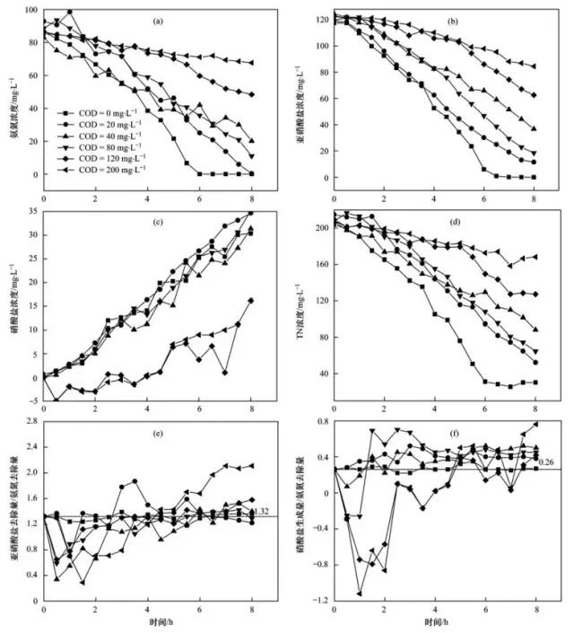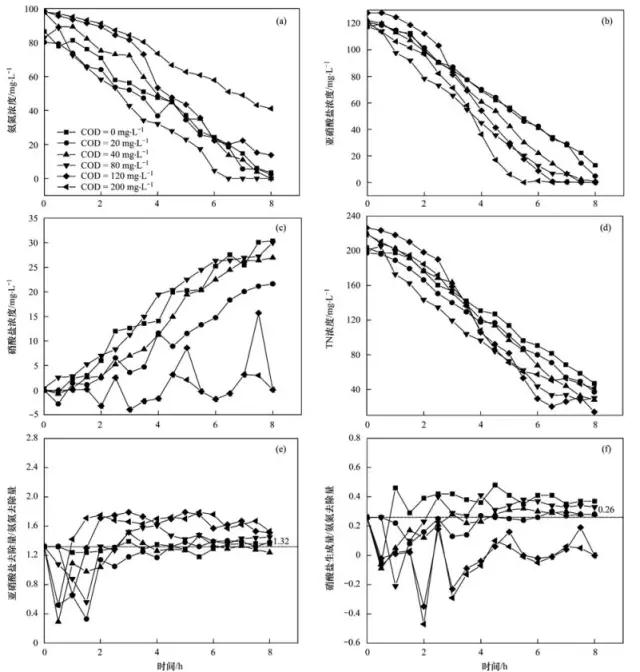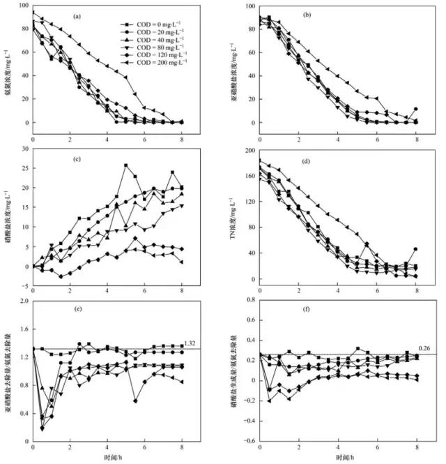 從圖 6(e)、6(f)中可以看出當蔗糖濃度大于40 mg˙L-1時,NO2--N與NH4+-N去除量的比值先升高后降低最后接近理論值,而NO3--N生成量與NH4+-N去除量的比值正好相反先降低后升高然后逐漸接近于理論值,而且NO2--N與NH4+-N的比值先升高或NO3--N與NH4+-N的比值先降低的過程隨著蔗糖濃度的升高逐漸變短.這一過程與之前葡萄糖和乙酸鈉不同,可能是因為蔗糖更容易被反硝化菌代謝.隨著反應的進行,系統中有機物被消耗,反硝化作用受到抑制,NO2--N去除量/NH4+-N去除量與NO3--N產生量/NH4+-N去除量的值逐漸接近理論值.