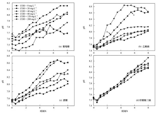 2.4 有機碳源作用下厭氧氨氧化系統pH的變化