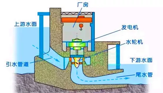 河床式水電站水頭低,不會形成大面積水庫,通常建在河流的中下游。河床式水電站樞紐最常見的布置方式是泄水閘(或溢流壩)在河床中部,廠房建在一邊或兩邊。廣西西津水電站是河床式水電站,圖2是該電站照片,左側是溢流壩攔截河水,右側是河床式廠房即攔截河水又讓通過的河水推動水輪機發(fā)電。
