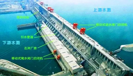 世界上最大的水電站我國的三峽水電站就是壩后式水電站,采用混凝土重力壩。圖5是從下游遠方眺望三峽水電站的照片,在照片中標出了主要壩段的分布:大壩中間部分是泄洪壩段,兩側是發(fā)電廠房壩段,再兩側是非溢流壩段。