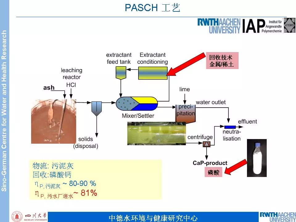 PASCH工藝的特點:PASCH工藝是從污泥焚燒的灰分中回收磷。該工藝磷回收率要大于90%;ISA研究所以及FraunhoferIME研究所的研究結果表明,污泥焚燒過程中有機污染物已經破壞,回收產品的無機雜質含量低,該產品具有良好的植物可利用性;IFEU研究所的研究結果,與其他回收工藝相比(例如協同焚燒、污泥直接農業利用等),PASCH工藝的生態評估具有明顯優勢。示范項目運行結果表明,PASCH工藝具有較低的成本。