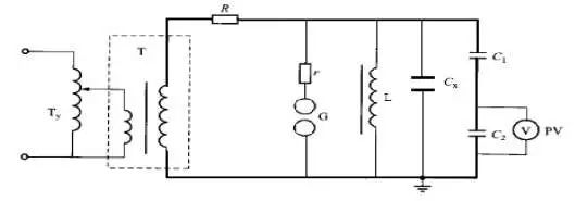 L—補償電抗器:CX—被試品電容: C1、C2—電容分壓器高、低壓臂:PV—電壓表