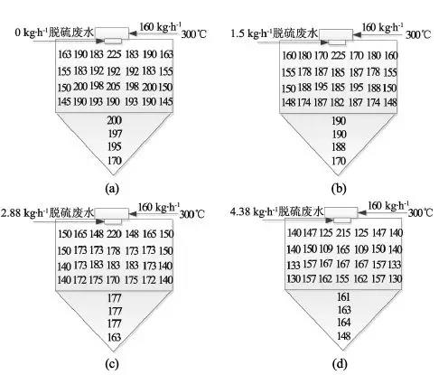 塔體溫度變化可以顯示不同區(qū)域內(nèi)脫硫廢水的蒸發(fā)特性,溫度下降越多,說明此區(qū)域蒸發(fā)反應(yīng)越激烈。