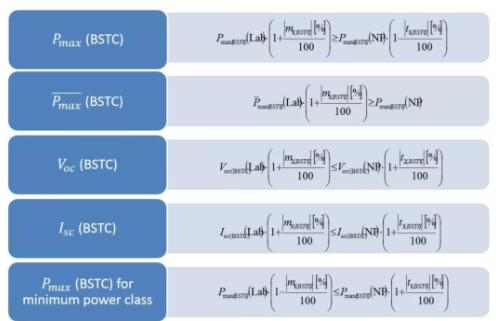 根據(jù)國際標準IEC 61215:2016的規(guī)定,光伏組件在進行任何進一步的測試之前都必須先穩(wěn)定其電性能。對于雙面組件,光致衰減(LID)等問題依然存在并且不可忽視。因此,TÜV 萊茵2PfG 2645/11.17 建立了一套對BSTC下測得的光伏數(shù)據(jù)進行銘牌驗證的體系,該體系對于Pmax、Pmax 的平均值、 Voc 以及 Isc 的判定要求和 IEC 61215-1:2016中的一致。 并且該體系中增加了對于最低功率檔組件在BSTC下的 Pmax 的額外要求來保證最低功率檔組件的質量。具體要求如下: