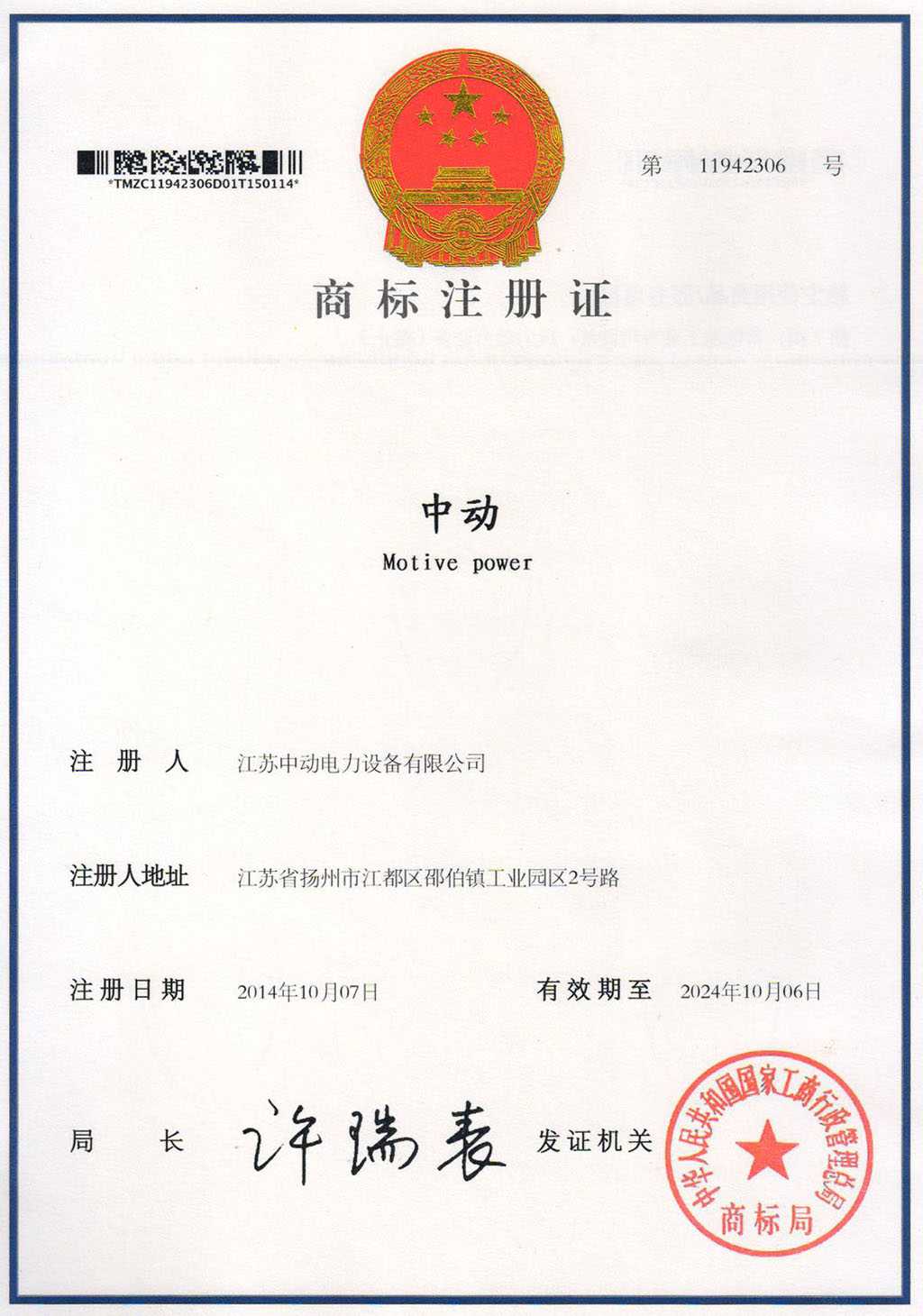 中動商標注冊證